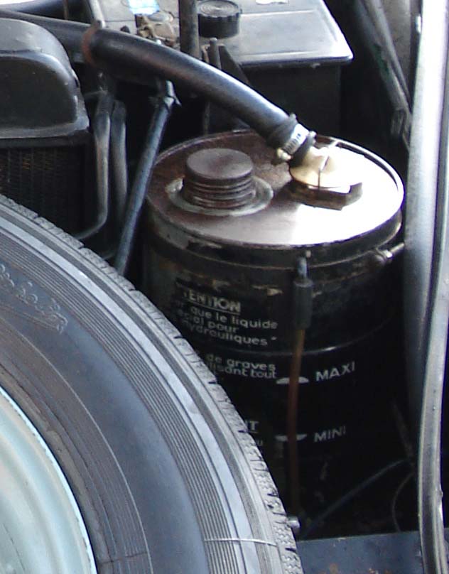 Au niveau des inscriptions sur le bidon, j'ai des doutes car sur cette photo d'une DS canadienne, le bouchon fileté et les inscripions sont différentes: "ATTENTION, n'utiliser que le liquide spécial pour freins Hydrauliques. Vous auriez de graves ennuis en utilisant tout autre produit"... IMPORTANT: vérifier le niveau moteur en marche et la voiture en position normale" |
