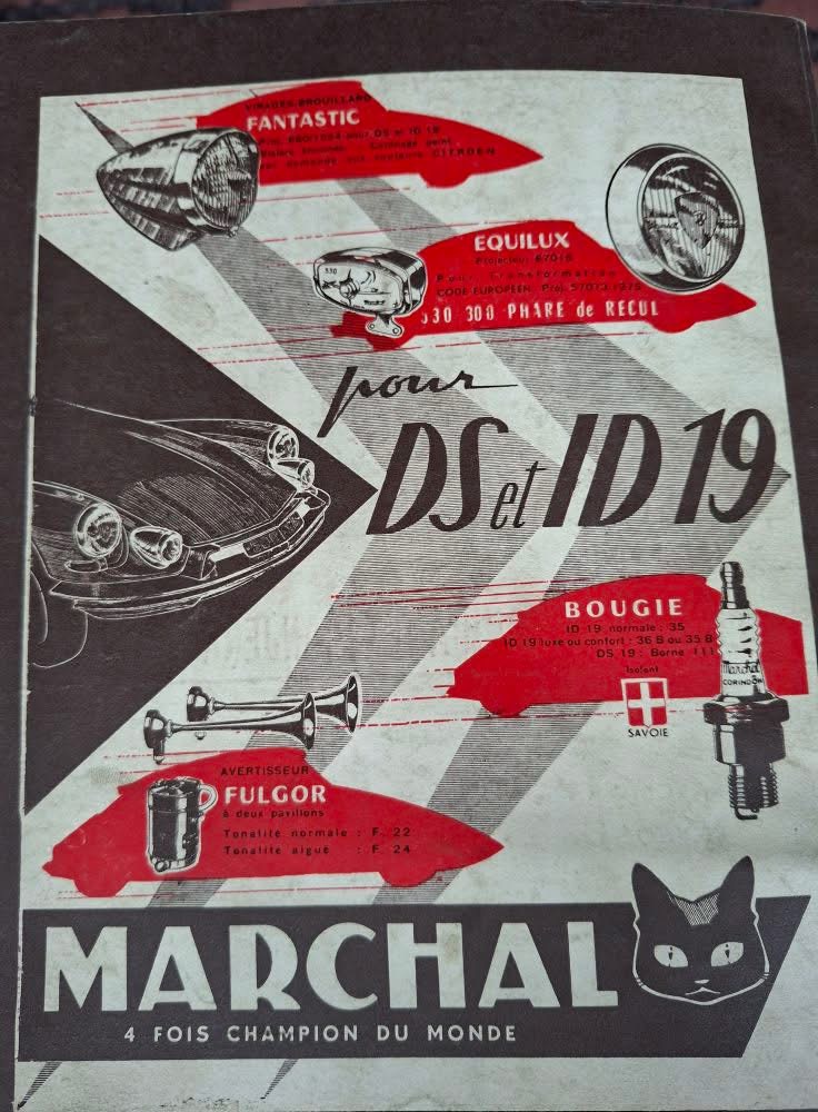 de marque Cibié ou Marchal. Les Marchal forment une légère casquette ou visière par rapport à l'aplomb du verre, qui comporte en son centre une sorte de têton. Voici les Marchal, on les voit surtout jusque 65. Leur nom, en toute modestie, est Marchal "Fantastic". Noter que selon les versions du doc, on parle d' "ID normale", ou d' "ID moteur 11D" ... les cerclages des optiques Cibié sont affleurant au verre, qui n'a pas de têton. Ils sont aussi un peu plus larges de diamètre (diamètre 150mm contre 120mm). Enfin leur corps est rectiligne et non légèrement courbé comme les Marchal. Voici les Cibié (sur une deuxième nez). |