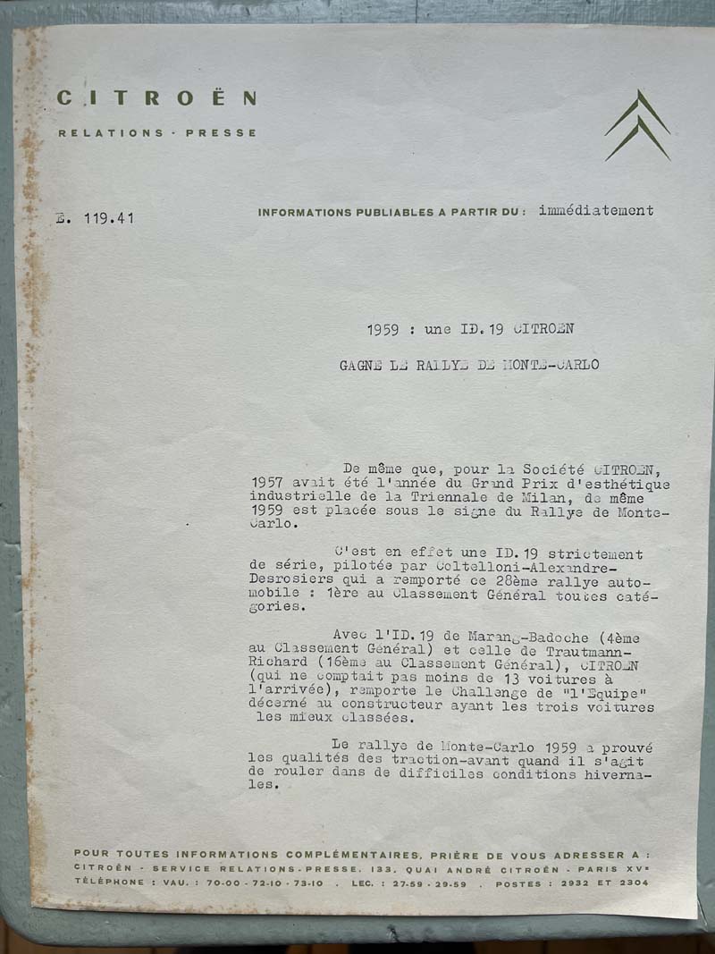 L'épopée et les événéments-clés de cette victoire mythique sont racontées de différentes manières dans les documents d'époque, vous verrez que les versions ne se contredisent pas vraiment, voici ce que j'ai retrouvé: - un texte paru dans un journal de propagande de Citroën: "comment nous avons gagné Monte Carlo 59". On notera qu'à la remise du trophée, Grace Kelly avait poussé l'élégance à assortir son manteau à la casquette à damiers du champion. - un article dans le bulletin destiné aux agents, où l'on visualise avec effroi le parcours de Paris à Monaco "au plus court", et où l'on comprend péniblement les définitions de la coupe Riviera, de la coupe Houbignant et du challenge "l'Equipe", posées sur le capot de l'ID victorieuse.