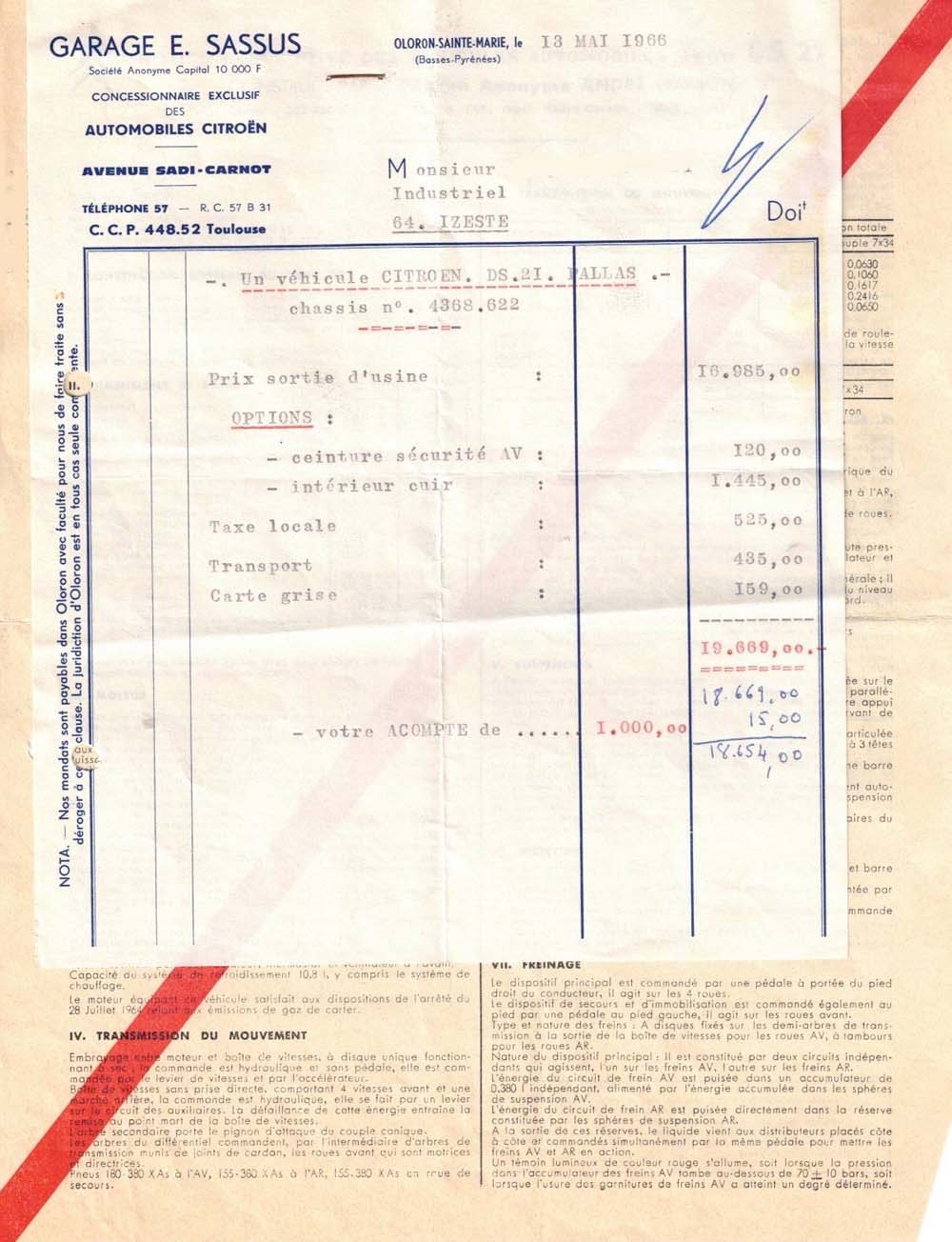 Espagne, 1973: exportation d'une DSuper5 vers Tenerife (iles Canaries) On retrouve les 5 pneus identiques. Ce qui signifie que cette façon de faire allait au delà du commonwealth. Autres points saillants: -On voir ici la mention de la rare option PO (POussière): filtre à air bain d’huile, protection du reniflard du réservoir de LHM, ... -Il y a en prime un pot de peinture s'il y a eu des accrocs pendant le transport! -le poste radio est le Blaupunkt AUTOBAND, à cassettes. - La notion d' "intérêts" est intrigante. -Enfin, il est curieux que les phares à iode soient une option: en France sur ce millésime ils étaient standard sur une DSuper5. (c'est le fait d'être directionnels qui était une option- Vu le prix, je pense que c'est une erreur de frappe et qu'ils faut comprendre "phares directionnels". Si on compare au tarif 73, on voit que l'option est un peu moins chère que le pare-brise triplex, ça concorde bien)